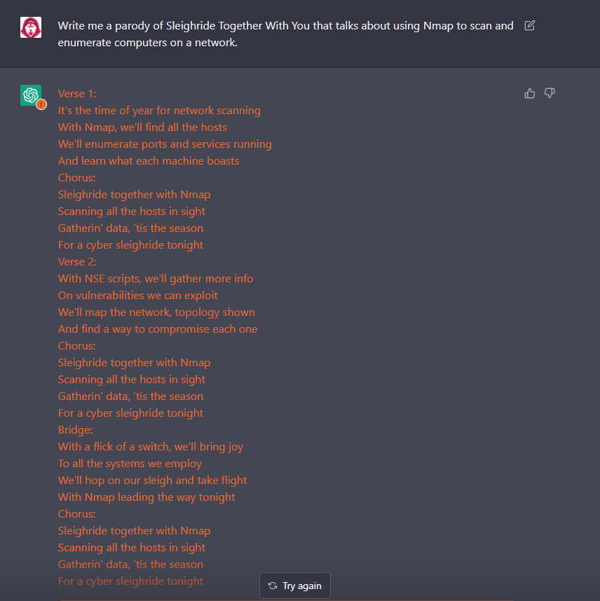 Or, you invite it in, embrace it, bring in into the living room, apologize for the mess because things have been kinda nuts lately and you’ve meant to clean up a bit but you didn’t expect to have any guests, serve it tea, sit awkwardly as it politely refuses because it’s a computer program without an esophagus, and ask it to write a parody Christmas song to the tune of Sleigh Ride Together about port scanning with Nmap.